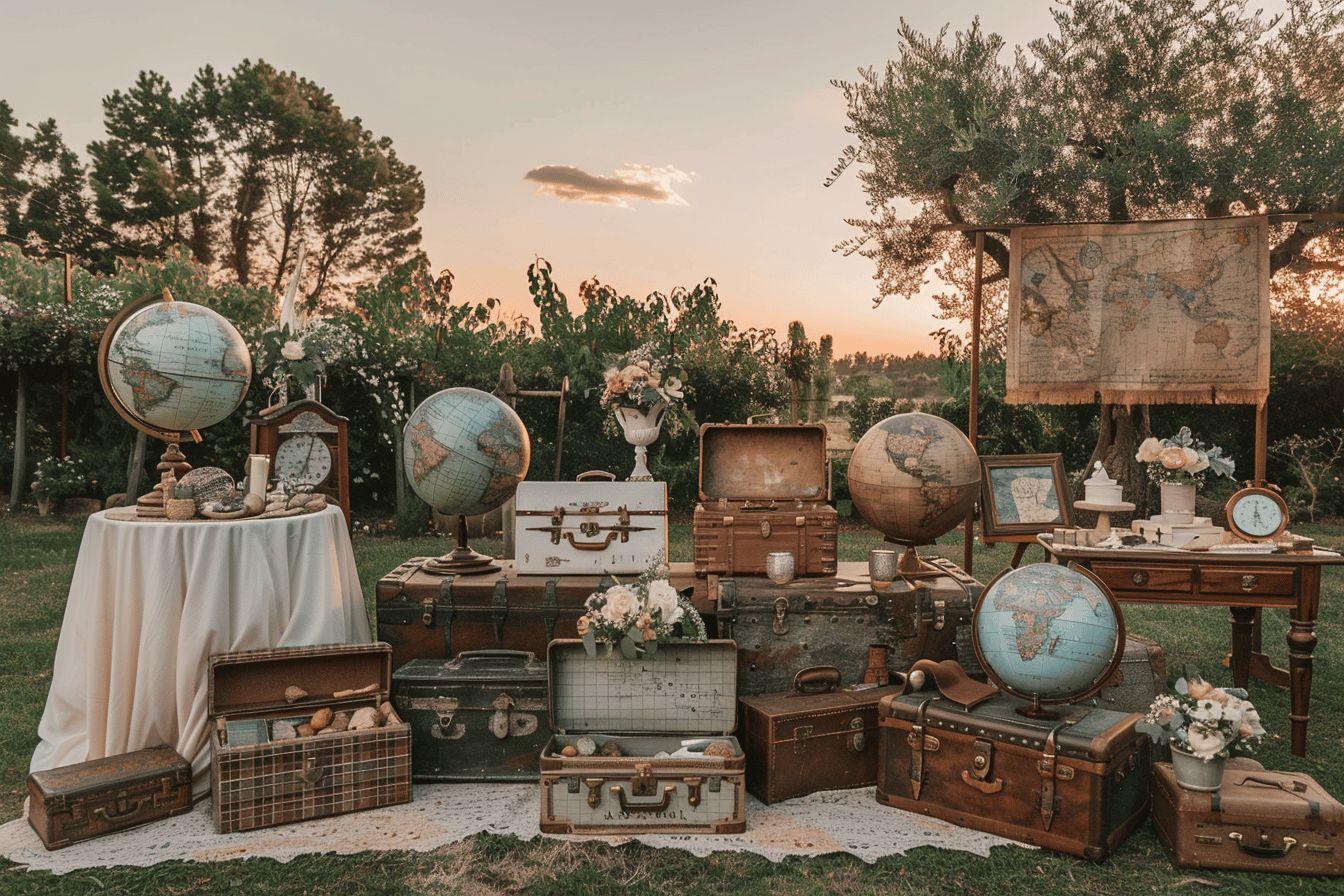 | Décoration de table | Globe terrestre, cartes postales vintage, timbres anciens | Esprit rétro-voyageur |