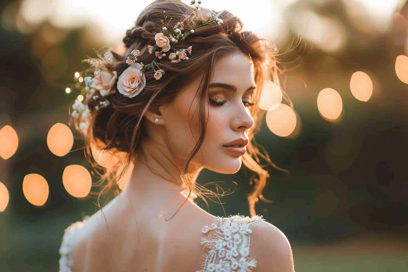 Pour compléter ce maquillage bohème chic pour mariage, optez pour des lèvres subtilement colorées avec un rouge à lèvres nude ou rosé. Ce choix accentue l’aspect naturel et romantique du look. N’oubliez pas d’ajouter une touche de blush sur les pommettes pour un effet bonne mine. Pour celles qui souhaitent s’aventurer un peu plus loin, une couronne de fleurs délicates peut être intégrée à la coiffure, ajoutant une note champêtre qui s’harmonise parfaitement avec l’ensemble. Ce style, à la fois simple et raffiné, promet de captiver tous les regards le jour de votre mariage.